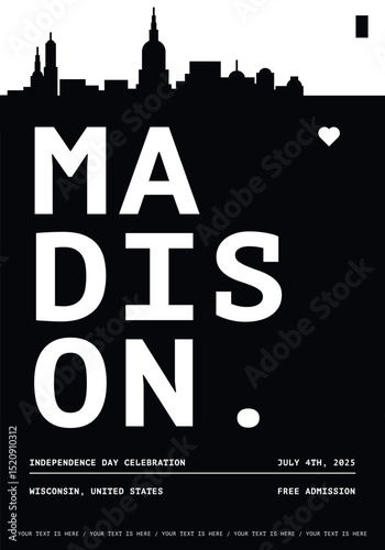 © Anastasiia, Fototapeta premium USA Madison typography minimalist vector poster for event, national festival, independence day, holiday layout. Brochure, leaflet, flyer, presentation image template for America, Wisconsin
