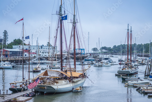 Fototapeta premium USA, Maine, Camden. Camden Harbor with schooners