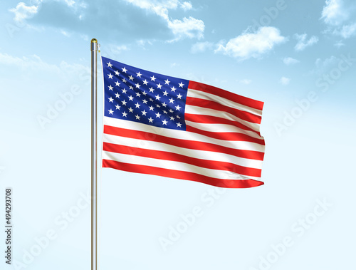 Fototapeta premium USA national flag waving in blue sky with clouds. America flag. 3D illustration