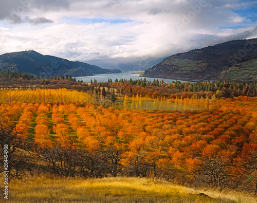 Naklejka premium USA, Oregon, Mosier. Cherry orchards display autumn color overlooking the Columbia River Gorge National Scenic Area.