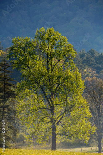 © Danita Delimont, Naklejka premium USA, Tennessee. Tree in morning light in field at Cades Cove.