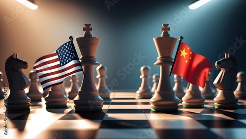 © Nugraha, Naklejka premium USA vs China Strategic Conflict Represented by Chess Pawns - 3D