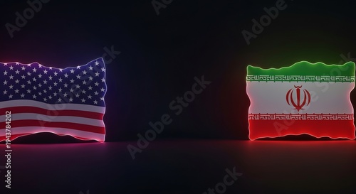 © sorin, Obraz premium USA vs Iran Abstract Conflict Concept Render with American and Iranian Flags in Space War Theme