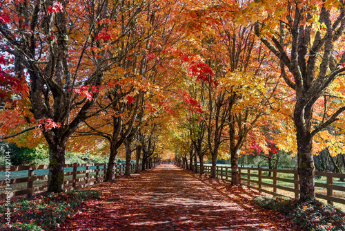 Naklejka premium USA, Washington State, North Bend. Fall color on maple tree lined driveway