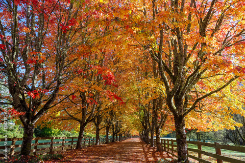 Naklejka premium USA, Washington State, North Bend. Fall color on maple tree lined driveway