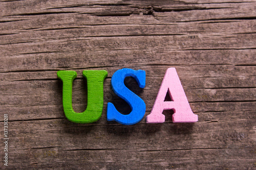 Fototapeta premium usa word made from colored wooden letters on an old table. Concept