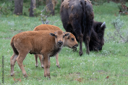 Fototapeta premium USA, Wyoming. Bison and calves, Yellowstone National Park.