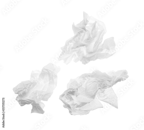 Fototapeta premium Used crumpled paper tissues isolated on white, top view