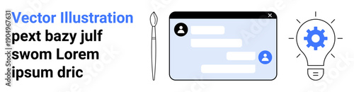 Obraz premium User interface, creative solutions, teamwork, communication, brainstorming, technology. Messaging screen with avatars, light bulb gear icon and design pen. User interface and creative solutions