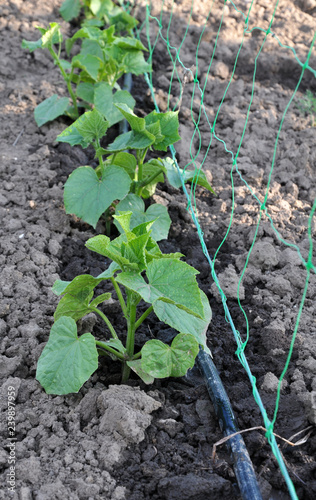 © orestligetka, Obraz premium Using a wallpaper grid and drip irrigation for growing cucumbers