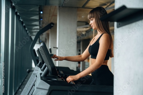© standret, Fototapeta premium Using modern equipment, cardio concept. Young woman is in the gym