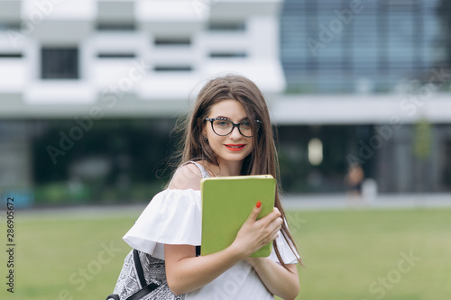 © uflypro, Obraz premium Using tablet device while walking the street. Woman tapping on the touchscreen and looking at camera