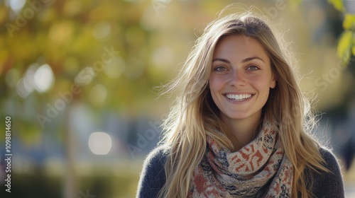 © Sawyer0, Obraz premium Uśmiechnięta kobieta z rozwianymi włosami i stylowym szalikiem uzupełniającym jej swobodny wygląd, promienieje pozytywną energią, stojąc w otoczeniu przyrody.