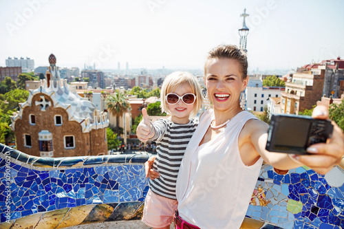 Fototapeta premium Uśmiechnięta matka i dziecko przy selfie z aparatem w Park Guell