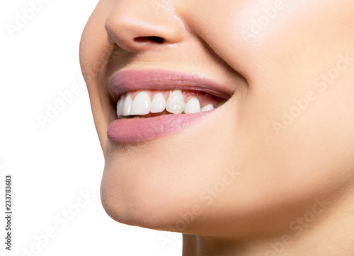 © Khorzhevska, Obraz premium Uśmiechnięta szczęśliwa kobieta. Roześmiany żeński usta z wielkimi zębami nad białym tłem. Zdrowy piękny uśmiech. Zdrowie zębów, wybielanie, protetyka i pielęgnacja.