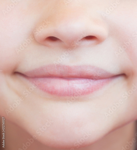 © ninell, Fototapeta premium Uśmiechnięte dziecko z bliska. Zbliżenie ust.