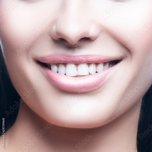 © beauty_objects, Fototapeta premium Usta, twarz, uśmiech pięknej modelki. Portret młodej kobiety częściowe piękno. Zdrowa, idealna skóra, naturalny makijaż nude. Odosobniony. Białe tło. Koncepcja pielęgnacji ciała do pielęgnacji twarzy