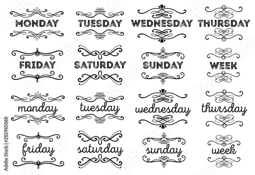 Fototapeta premium Ustaw tydzień tytułowy, tekst i wirowanie, stempel odciskowy, kalendarz, notatkę, terminarz. Elegancki styl vintage.