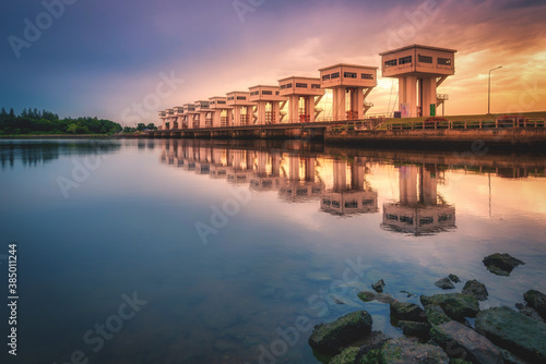 © nuttawutnuy, Fototapeta premium Utho Wipat prasit floodgates at sunset in pak phanang, Nakhon Si Thammarat, Thailand.
