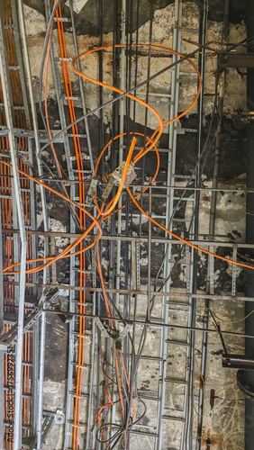 Fototapeta premium Utility lines and electrical cables secured to the ceiling of an industrial or office building. Installation of cable trays, electrical, and network cables during renovation or construction.