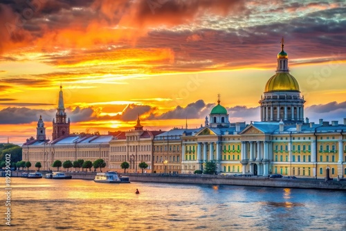 © VitAnh, Obraz premium Utilize the White Nights phenomenon in Saint Petersburg, where the sun barely sets in summer. Design a background with an extended sunset and historic buildings along the Neva River.
