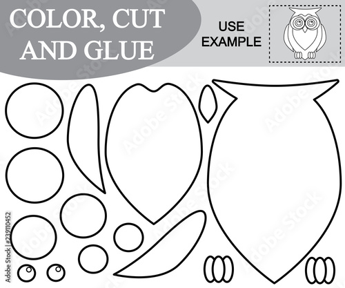 Naklejka premium Utwórz obraz sowy za pomocą nożyczek i kleju, kolorowanka. Gra dla dzieci....