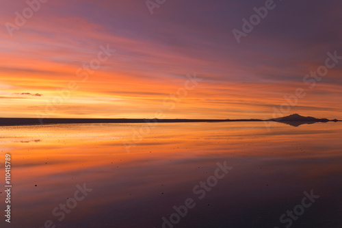 © Yori Hirokawa, Naklejka premium 雲と山のシルエットが水面に反射するウユニのサンセット。Uyuni gradational sunset, clouds and mountain silhouette reflected surface of the water.