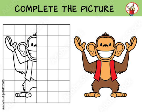 Naklejka premium Uzupełnij obrazek śmiesznej małpy. Skopiuj zdjęcie. Kolorowanka. Gra...
