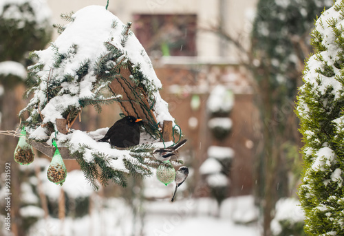Fototapeta premium Vögel im Vogelhaus im Garten mit Schnee