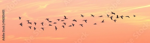 Obraz premium V-shaped flock of birds gliding through a peach-colored autumn sky, thin...