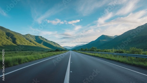© Rizvan, Naklejka premium Vacant asphalt highway amid natural scenery under a blue sky backdrop