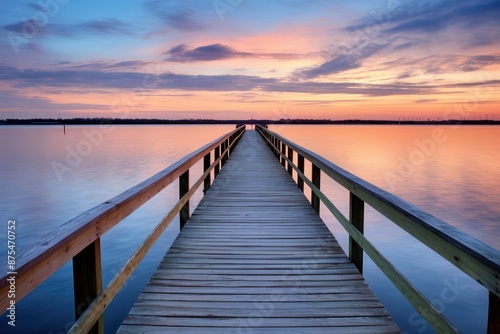 Naklejka premium Vacant fishing pier at sunrise with calm waters and a serene setting, perfect...