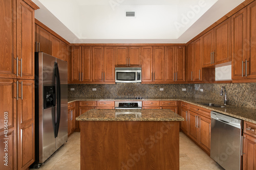 Fototapeta premium Vacant Kitchen with cherry wood cabinets and center island with granite.
