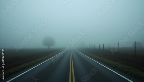 © Teerapat, Fototapeta premium Vacant rural road stretching into fog, moody desaturated style