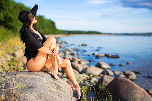 Fototapeta premium vacation concept - young beautiful woman in bikini sitting on rocky beach