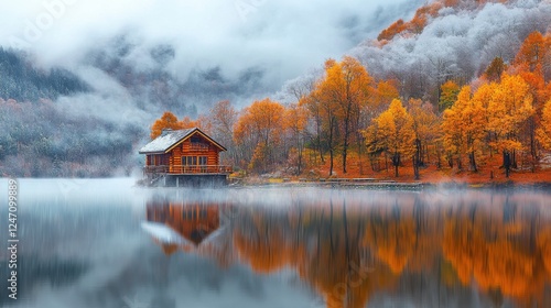 © ANDREI, Fototapeta premium Vacation house with scenic view in Fall with colorful foliage by lake