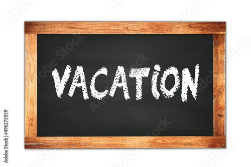Fototapeta premium VACATION text written on wooden frame school blackboard.