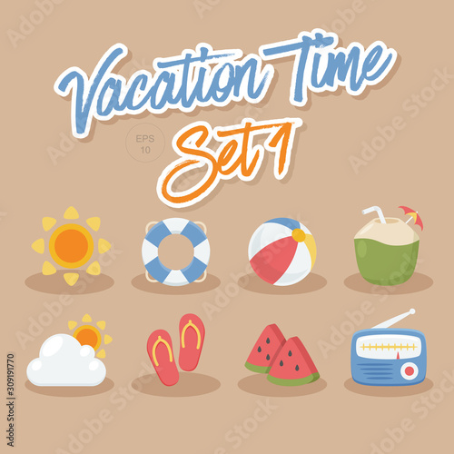 Naklejka premium Vacation Time Set 1, Beach, Summer, Hot season, Icon, iconset, Vector Illustration, Banner, Web, Design, Template, Elements.