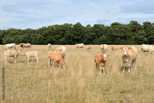 © S. Leitenberger, Obraz premium Vaches race blonde d'Aquitaine au pré pendant une période de sécheresse, herbe jaunie
