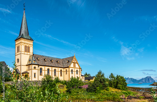 Fototapeta premium Vagan Church, called Lofoten Cathedral, situated in Kabelvag village in Austvagoya island. Waters of Vestfjord are at right background. Nordland, Northern Norway.