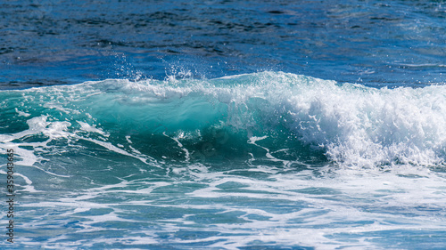Obraz premium Vague déroulant sur un spot de surf avec de l'écume blanche et des embruns un...