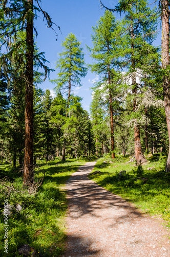 Fototapeta premium Val Roseg, Ova da Roseg, Rosegbach, Rosegtal, Wanderweg, Wald, Waldweg,...