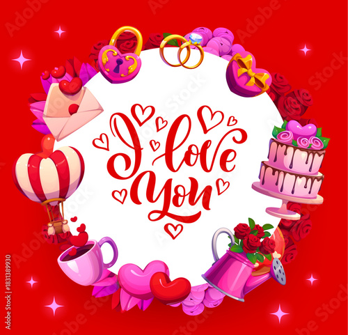 Naklejka premium Valentine day greeting card for love holiday with hearts and flowers, vector background. Valentine day or wedding marriage greeting card, I Love You quote in frame of balloon, wedding rings and gifts