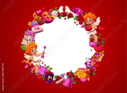Fototapeta premium Valentine day holiday banner with hearts and cupids in frame of love symbols, vector greeting card. Valentine day, wedding or marriage banner with doves couple kissing, diamond ring and chocolates