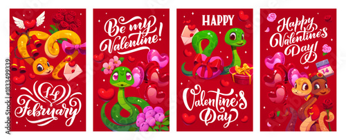 Naklejka premium Valentine Day holiday greeting cards and posters with funny snakes and love hearts, cartoon vector. Happy Valentine day and I Love You quotes with snake couples, heart balloons, gifts and flowers