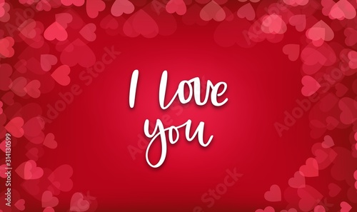 © vladico, Naklejka premium Valentine day, wedding postcard. Background with red hearts and bokeh. I love you lettering hand drawn