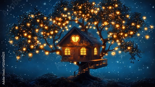 © Sirilak, Fototapeta premium Valentine emotion eternity. A whimsical treehouse adorned with glowing lights, nestled among branches, creates a magical nighttime atmosphere.
