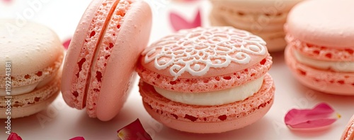 © Jiraporn, Obraz premium Valentine macarons idea. Delicious pink macarons with intricate designs on a soft background.