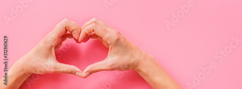 Fototapeta premium Valentine's day background. Female hands making hearth shape. Flat lay, top...