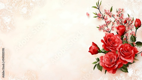 © PixelPlace, Obraz premium Valentine's Day cards printable. A vibrant arrangement of red roses and delicate blossoms on a soft background, perfect for celebrations and romantic occasions.